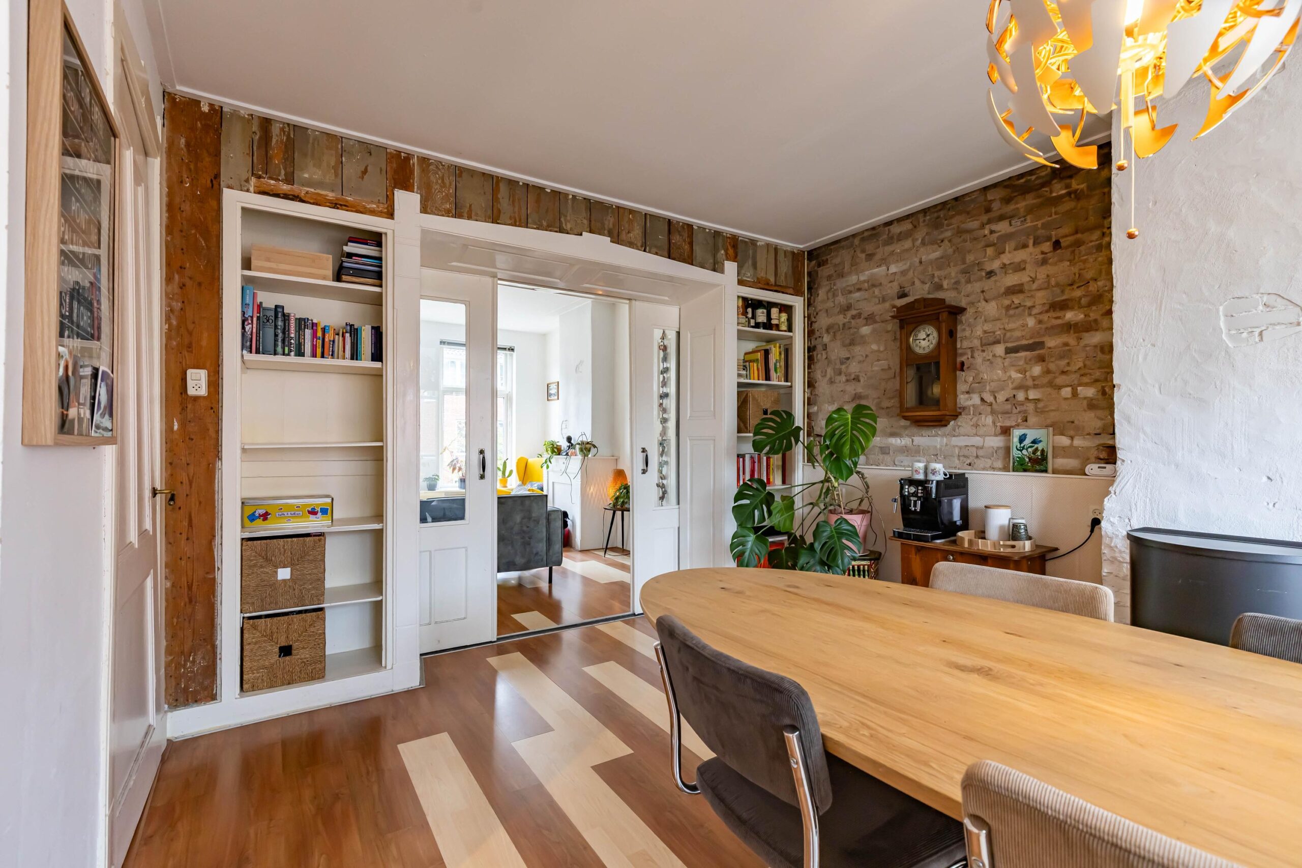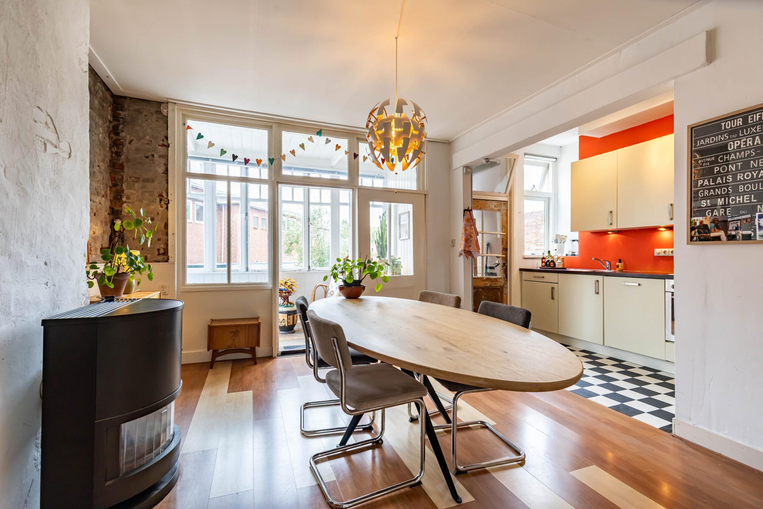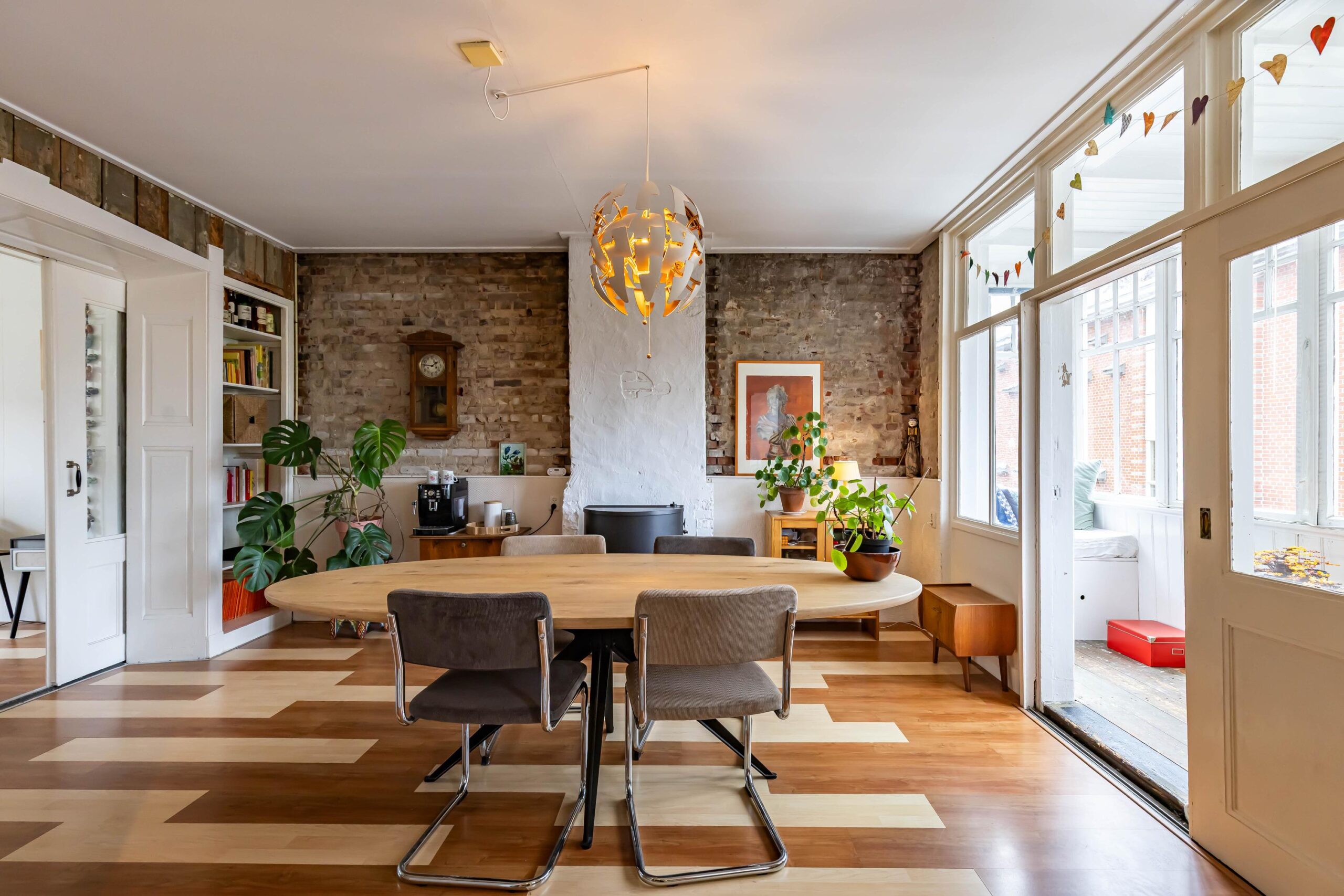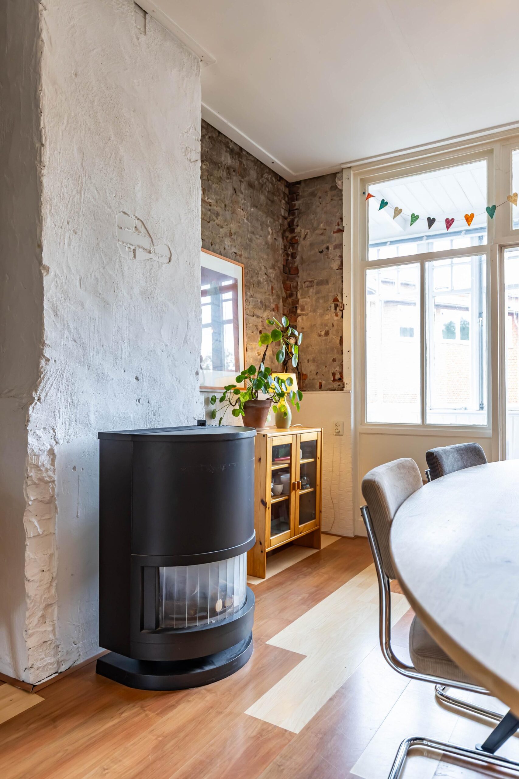 Vanuit de hal kom je binnen in de ruime woonkeuken, met volop plek voor een grote eettafel, de ideale plek om ’s ochtends samen te ontbijten met het gezin of ’s avonds te genieten van een gezellig diner met vrienden. De combinatie van baksteen en stucwerk zorgt voor een warme, karaktervolle sfeer in deze ruimte. De keuken zelf is praktisch ingericht en voorzien van onder andere een 4-pits gastoestel met oven en een koelkast. Vanuit de keuken heb je toegang tot de loggia, een fijne plek om in het zonnetje te zitten en te genieten van een goed boek of een kop koffie. Via de authentieke ensuite-deuren bereik je de lichte en gezellige woonkamer, waar je een fijne zithoek kunt creëren.