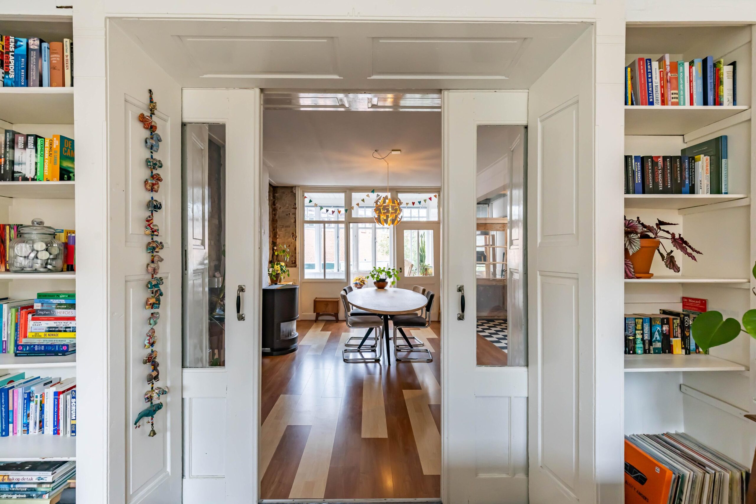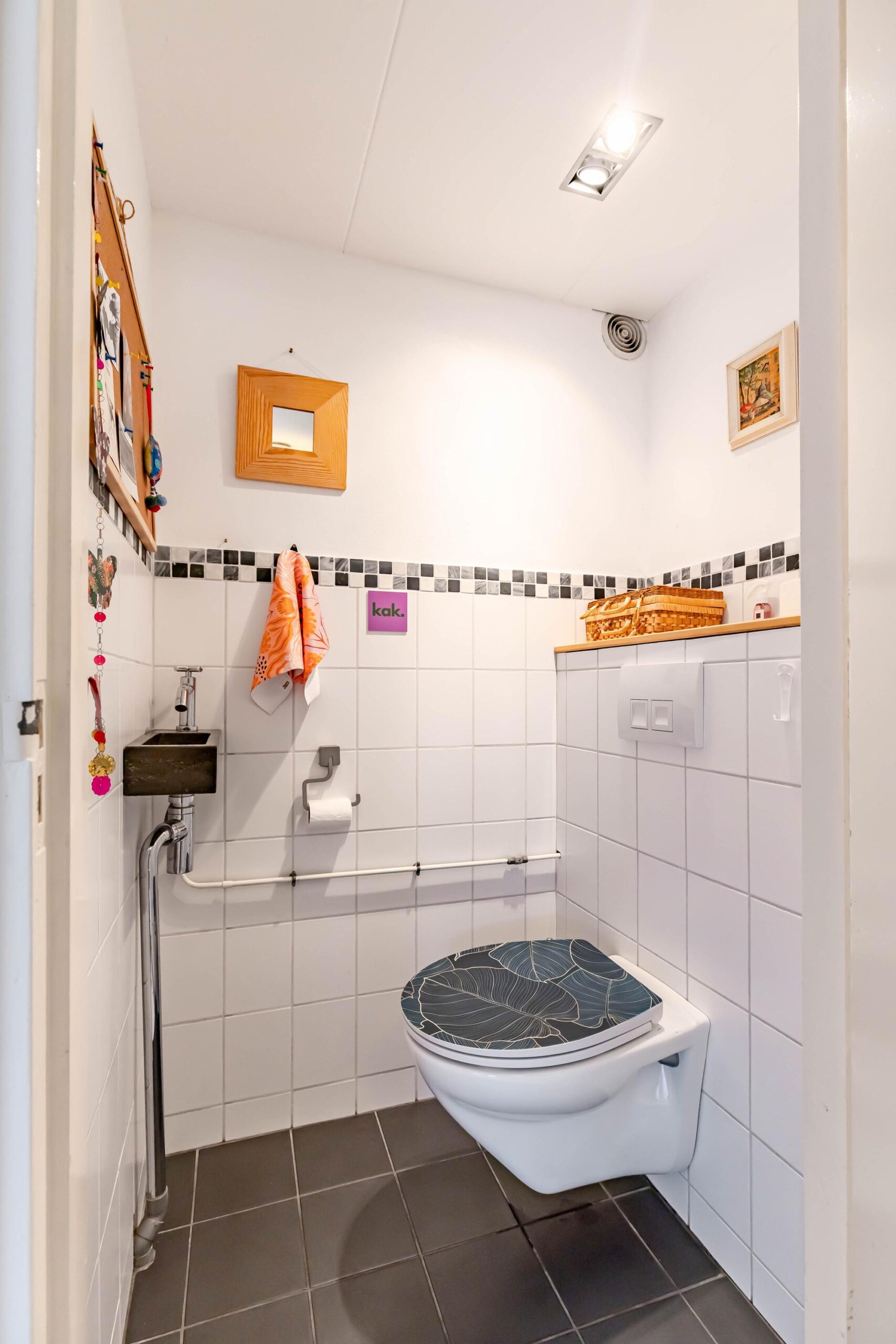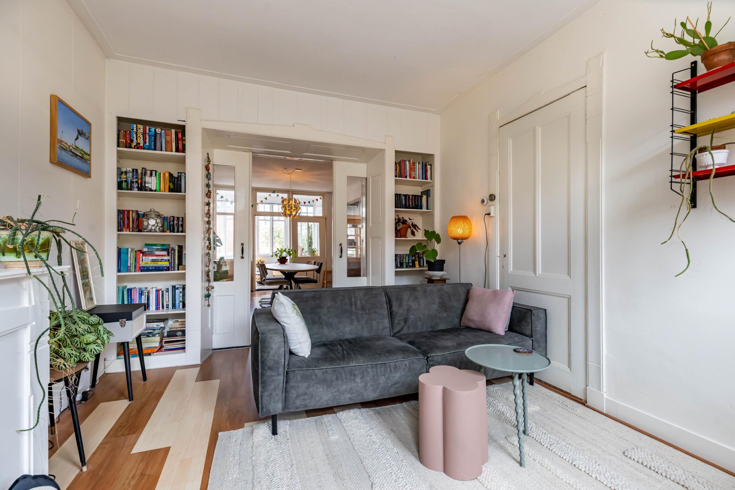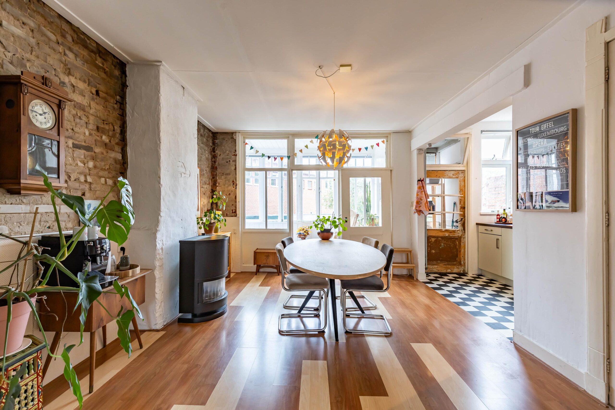 Vanuit de hal kom je binnen in de ruime woonkeuken, met volop plek voor een grote eettafel, de ideale plek om ’s ochtends samen te ontbijten met het gezin of ’s avonds te genieten van een gezellig diner met vrienden. De combinatie van baksteen en stucwerk zorgt voor een warme, karaktervolle sfeer in deze ruimte. De keuken zelf is praktisch ingericht en voorzien van onder andere een 4-pits gastoestel met oven en een koelkast. Vanuit de keuken heb je toegang tot de loggia, een fijne plek om in het zonnetje te zitten en te genieten van een goed boek of een kop koffie. Via de authentieke ensuite-deuren bereik je de lichte en gezellige woonkamer, waar je een fijne zithoek kunt creëren.