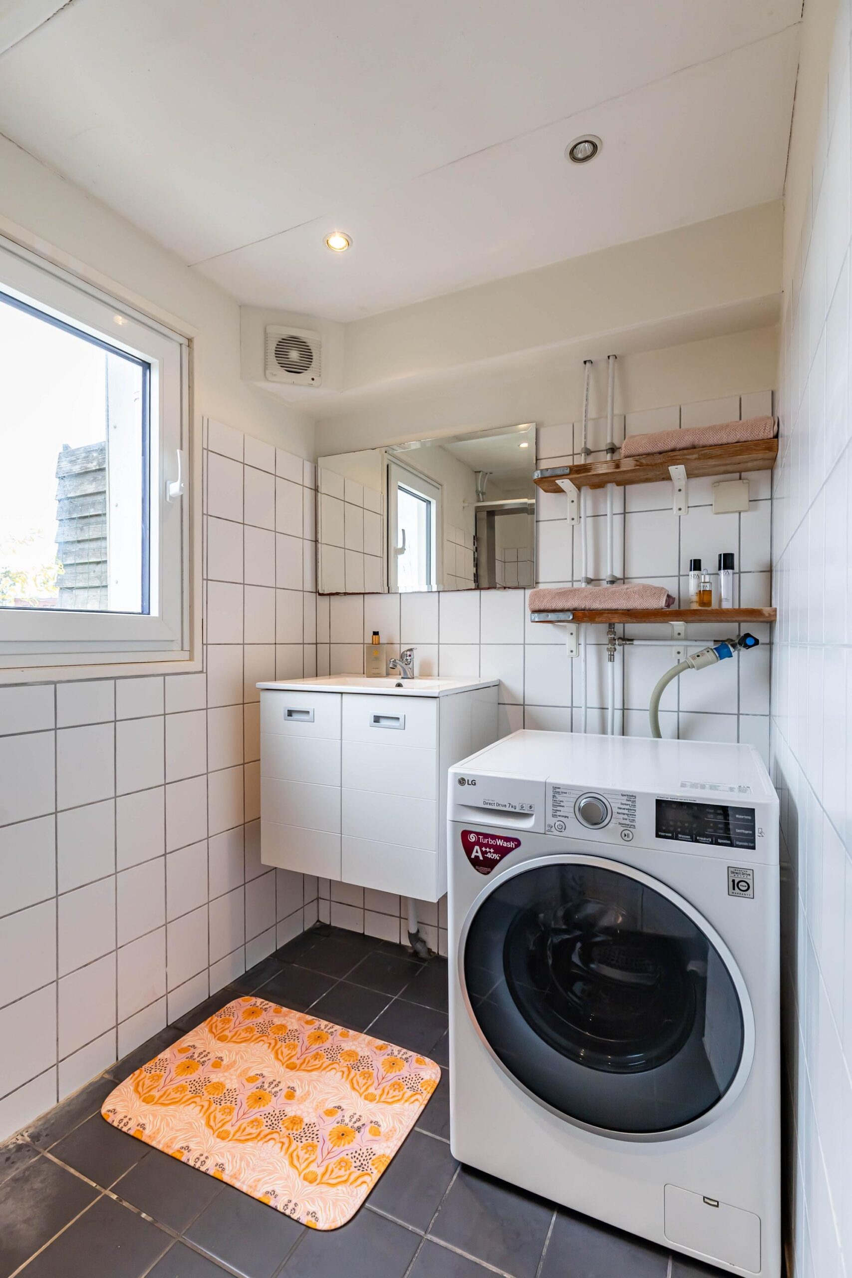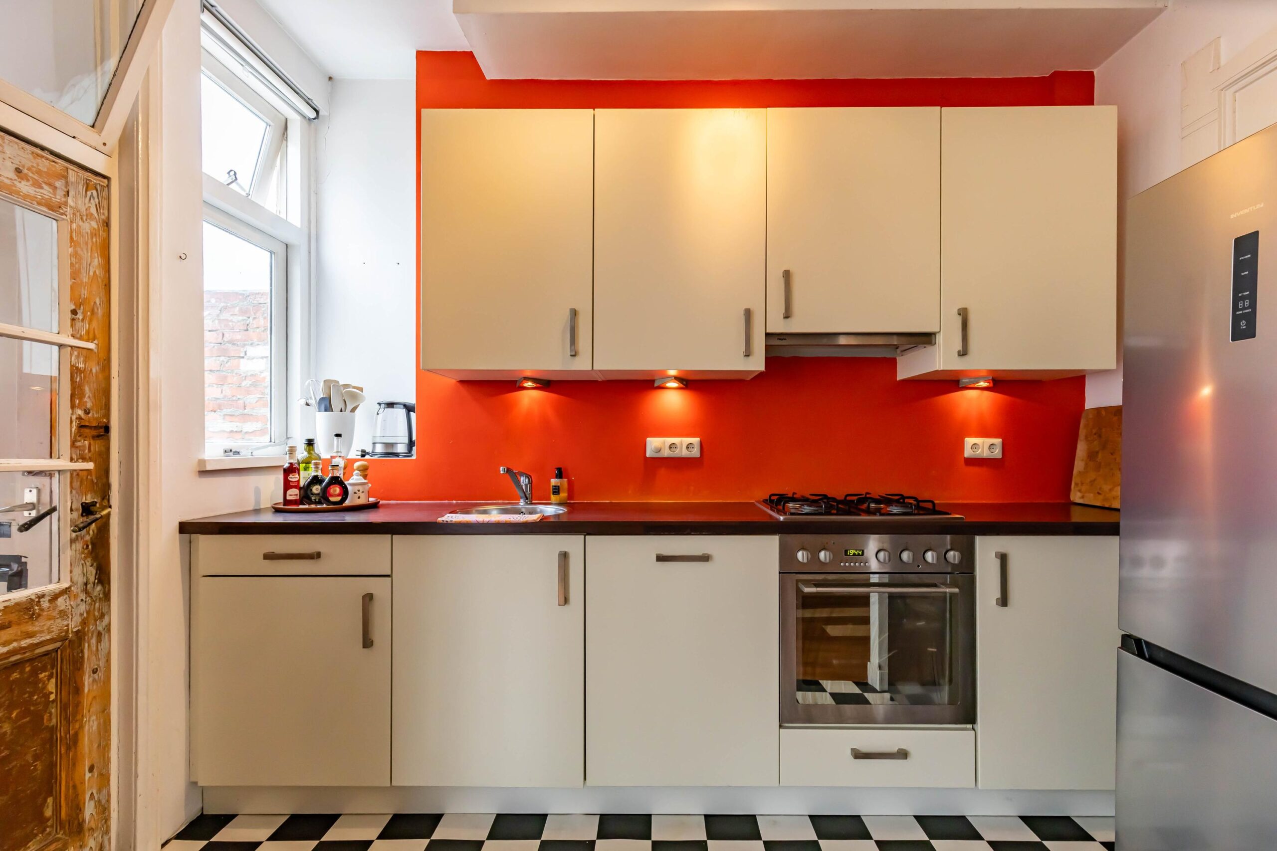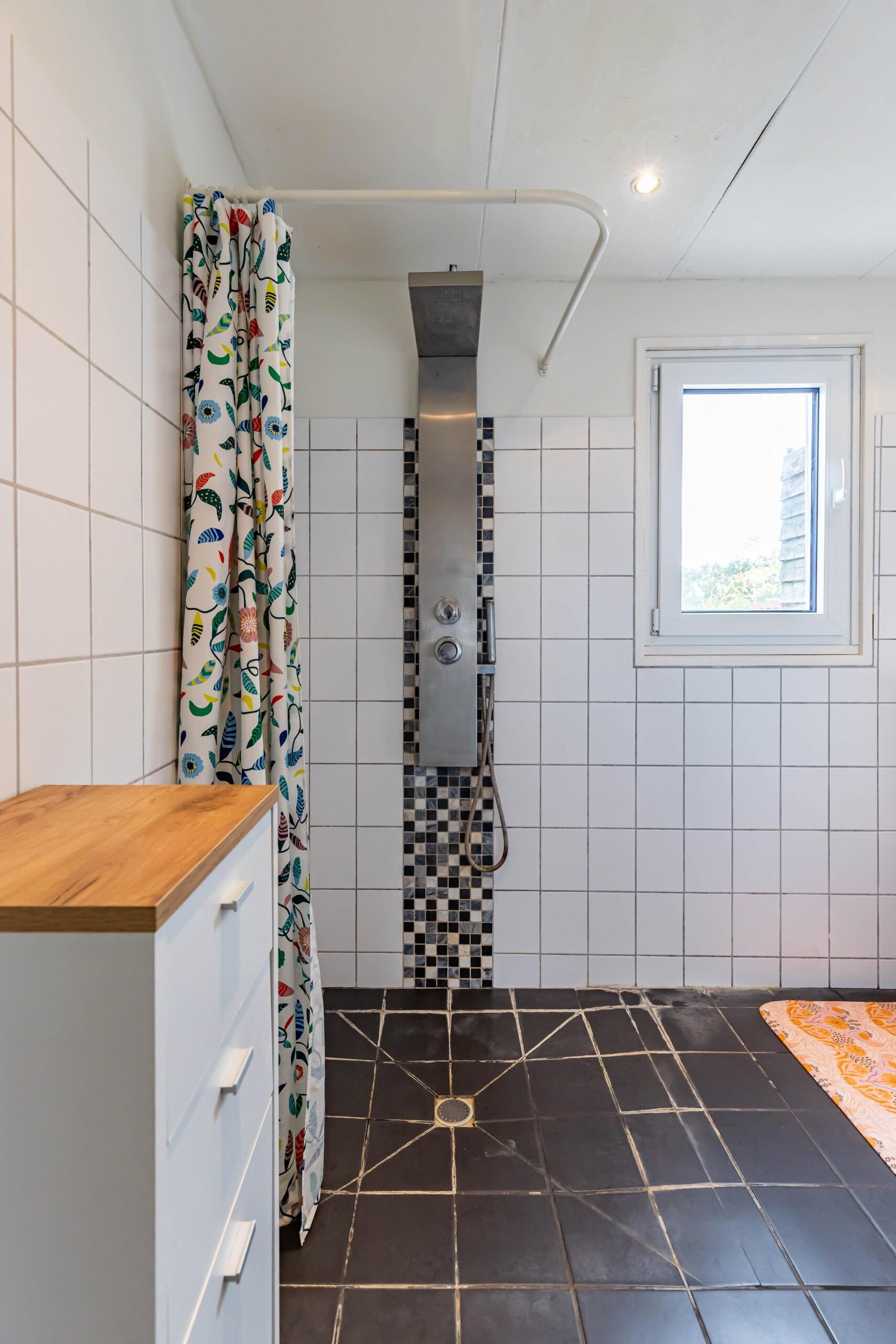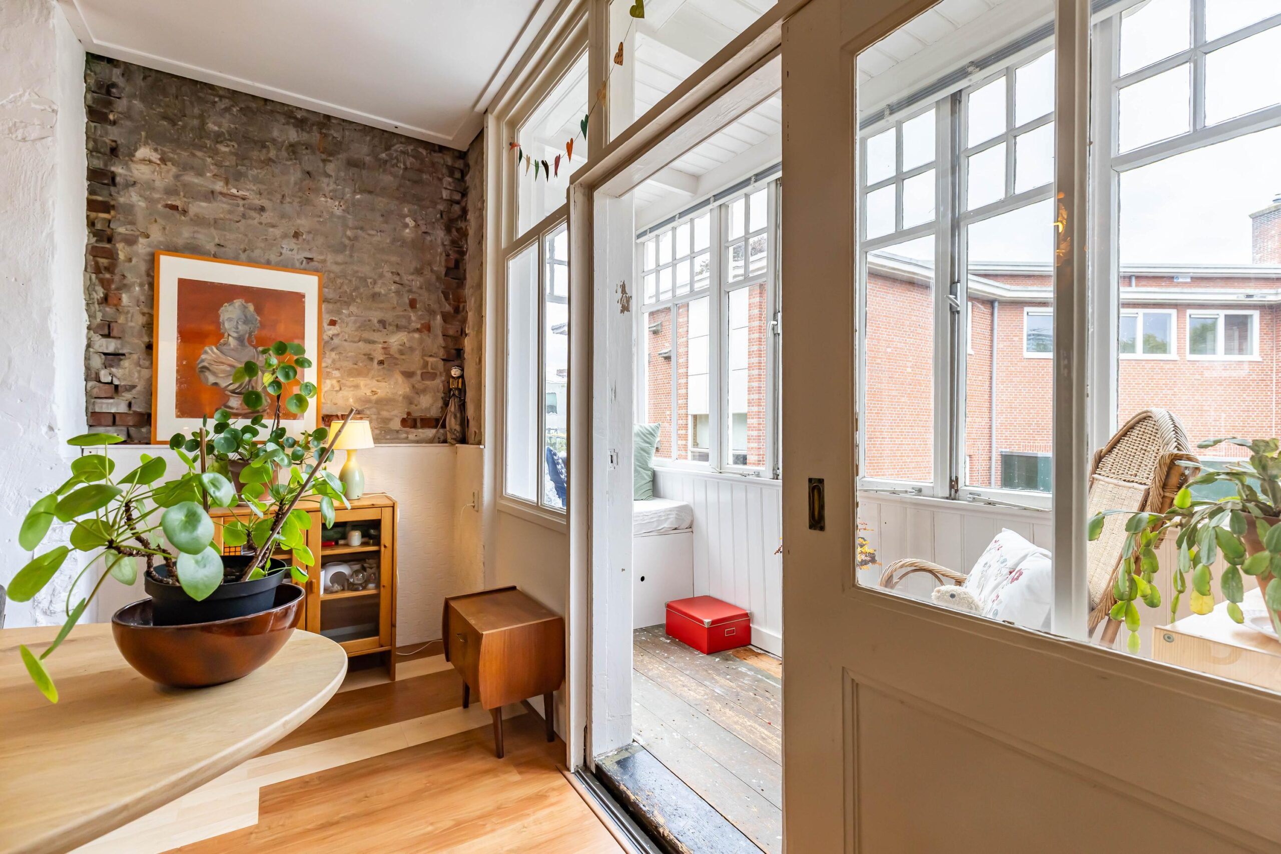 Vanuit de hal kom je binnen in de ruime woonkeuken, met volop plek voor een grote eettafel, de ideale plek om ’s ochtends samen te ontbijten met het gezin of ’s avonds te genieten van een gezellig diner met vrienden. De combinatie van baksteen en stucwerk zorgt voor een warme, karaktervolle sfeer in deze ruimte. De keuken zelf is praktisch ingericht en voorzien van onder andere een 4-pits gastoestel met oven en een koelkast. Vanuit de keuken heb je toegang tot de loggia, een fijne plek om in het zonnetje te zitten en te genieten van een goed boek of een kop koffie. Via de authentieke ensuite-deuren bereik je de lichte en gezellige woonkamer, waar je een fijne zithoek kunt creëren.