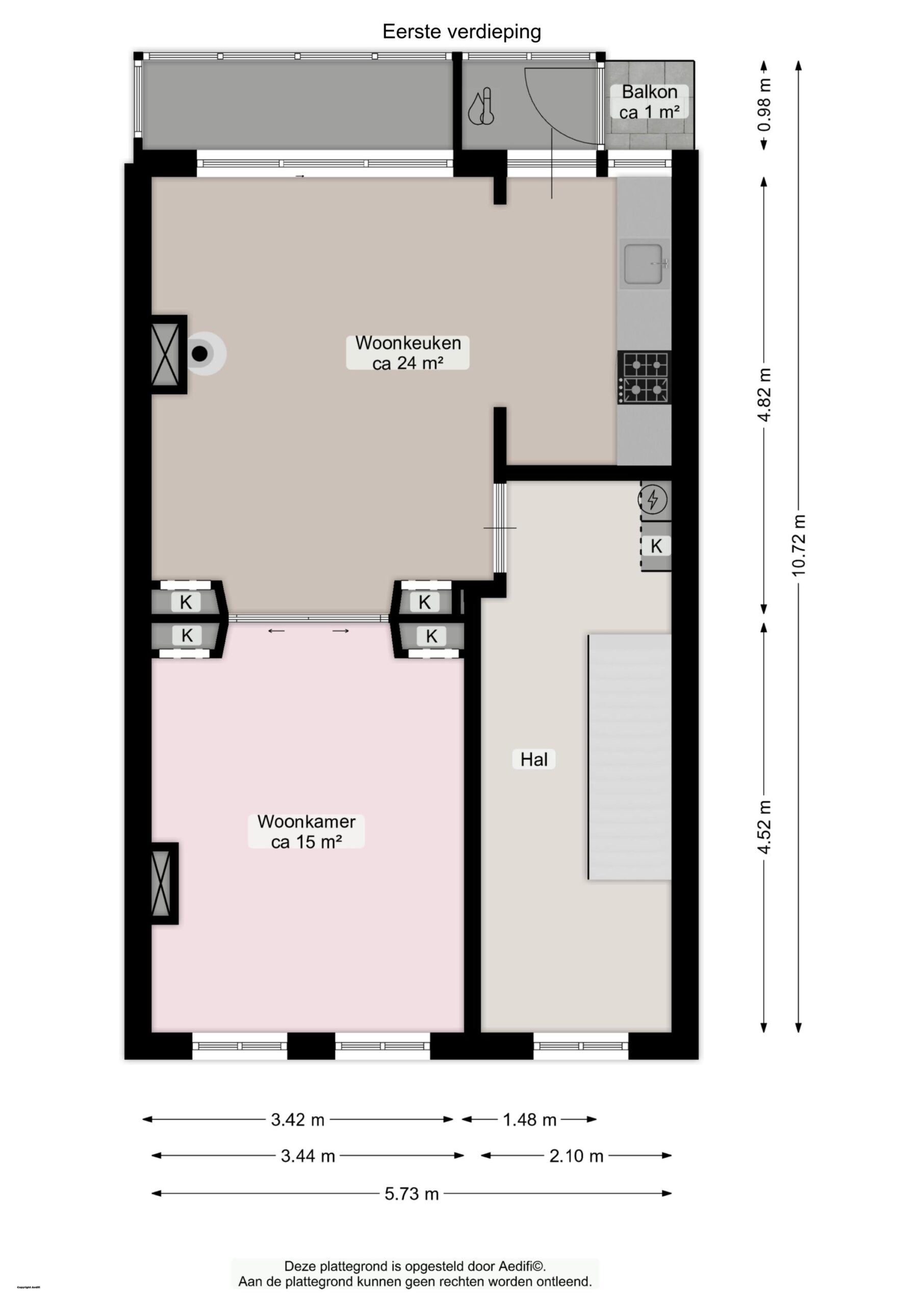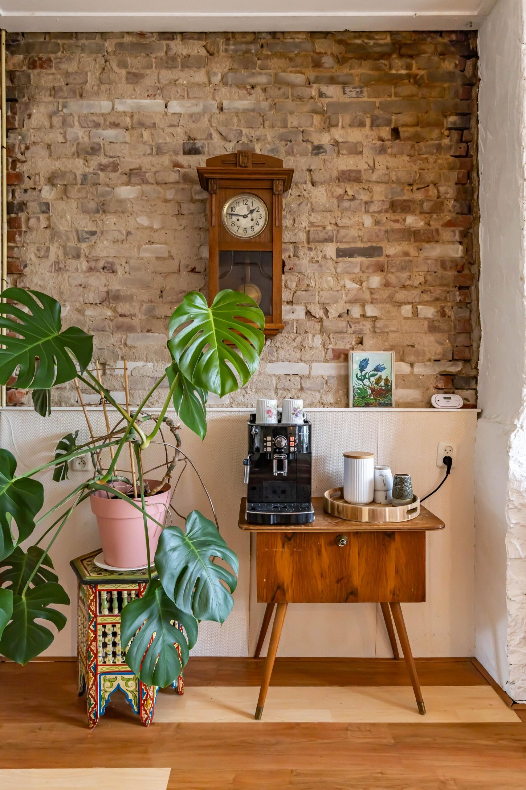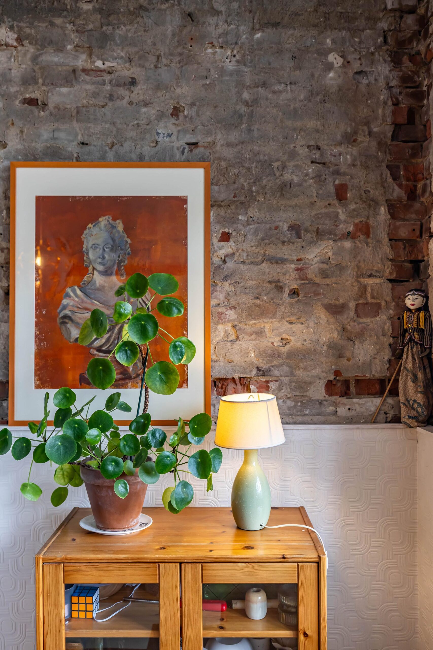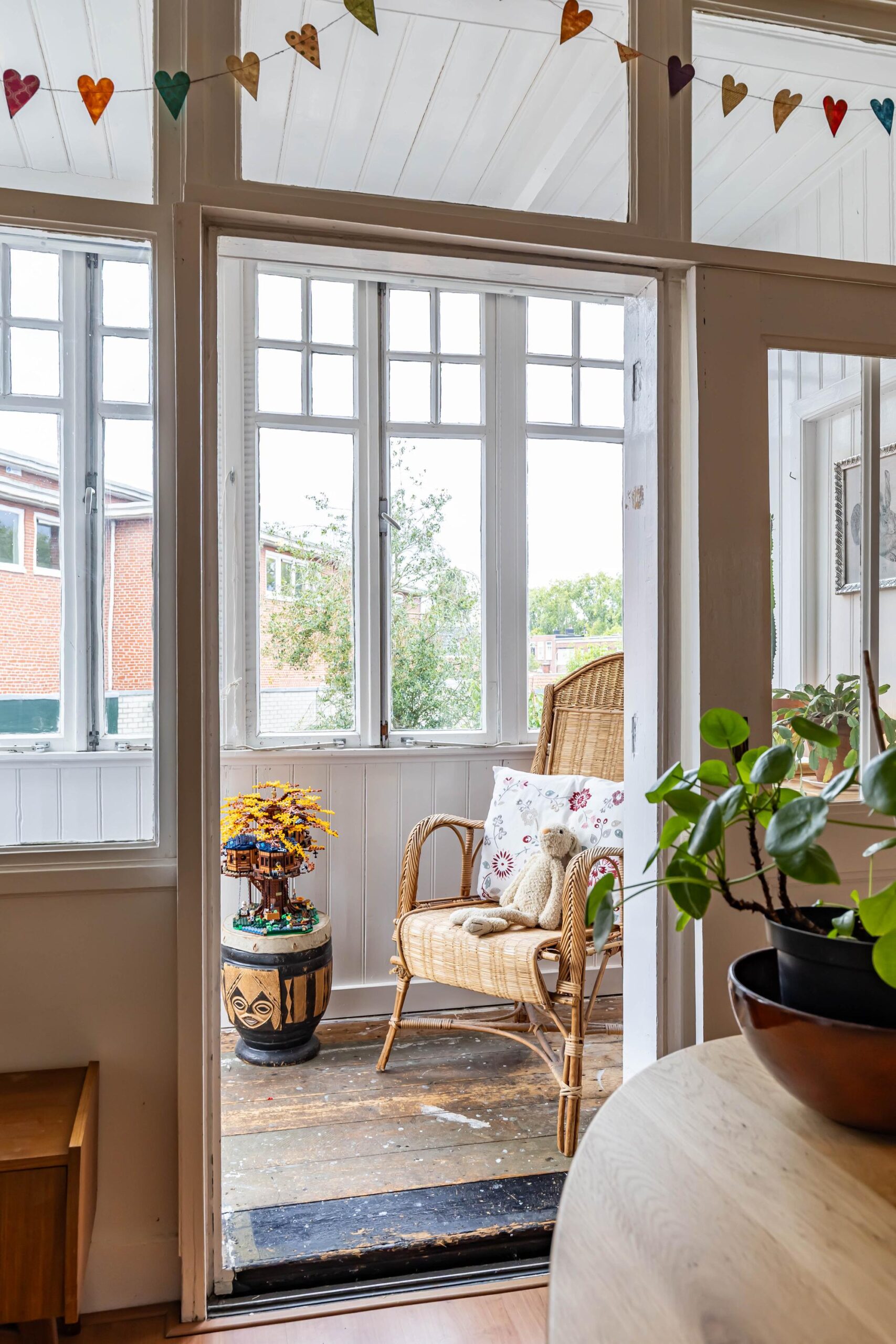 Vanuit de hal kom je binnen in de ruime woonkeuken, met volop plek voor een grote eettafel, de ideale plek om ’s ochtends samen te ontbijten met het gezin of ’s avonds te genieten van een gezellig diner met vrienden. De combinatie van baksteen en stucwerk zorgt voor een warme, karaktervolle sfeer in deze ruimte. De keuken zelf is praktisch ingericht en voorzien van onder andere een 4-pits gastoestel met oven en een koelkast. Vanuit de keuken heb je toegang tot de loggia, een fijne plek om in het zonnetje te zitten en te genieten van een goed boek of een kop koffie. Via de authentieke ensuite-deuren bereik je de lichte en gezellige woonkamer, waar je een fijne zithoek kunt creëren.