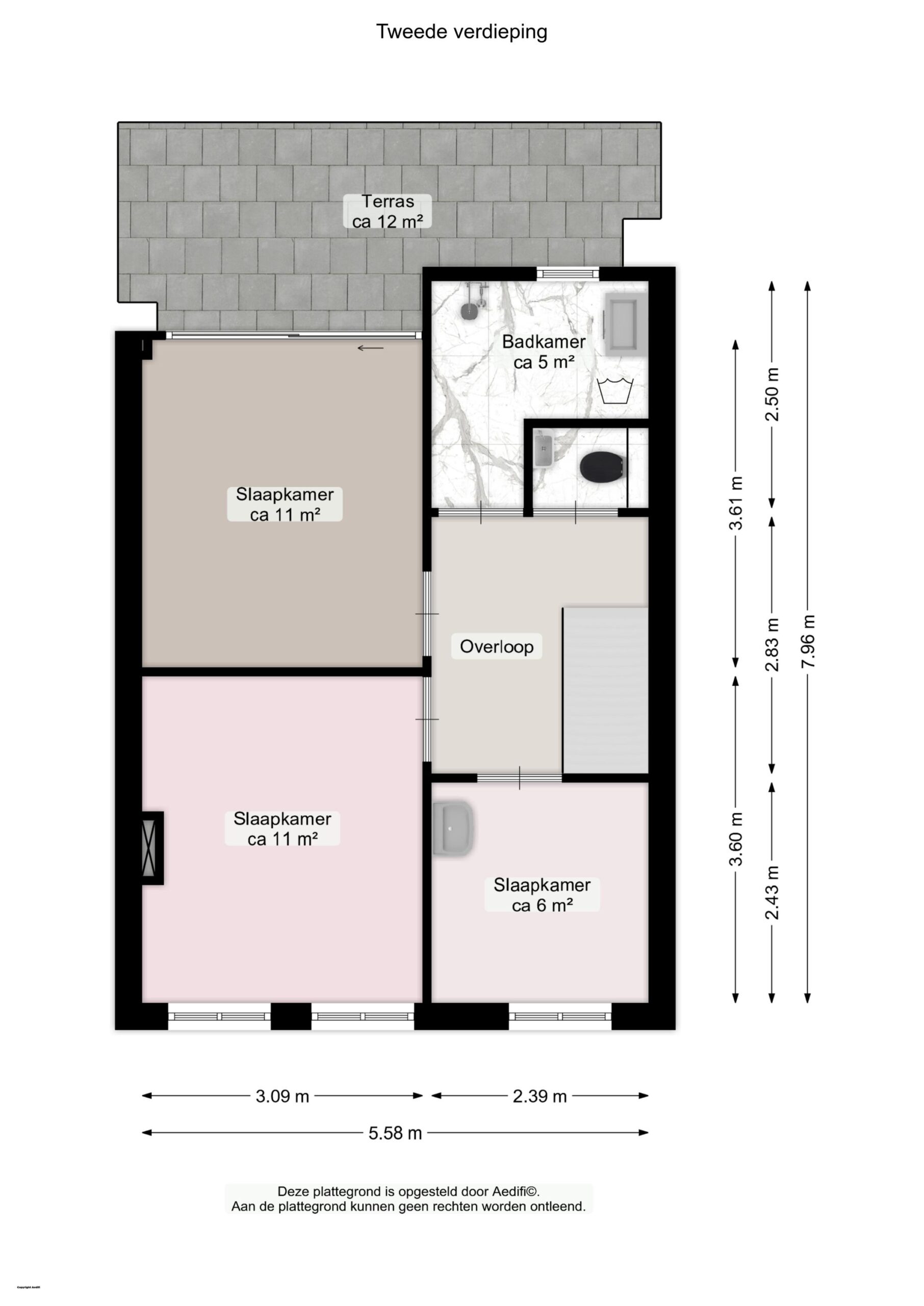 Deze verdieping beschikt over drie slaapkamers van circa 11, 11 en 6 m². De slaapkamer aan de achterzijde biedt toegang tot het zonnige dakterras van circa 12 m², waar je heerlijk kunt genieten van de buitenlucht. De badkamer is voorzien van een douche, wastafelmeubel en aansluiting voor de wasmachine. Het separate toilet is bereikbaar via de overloop.