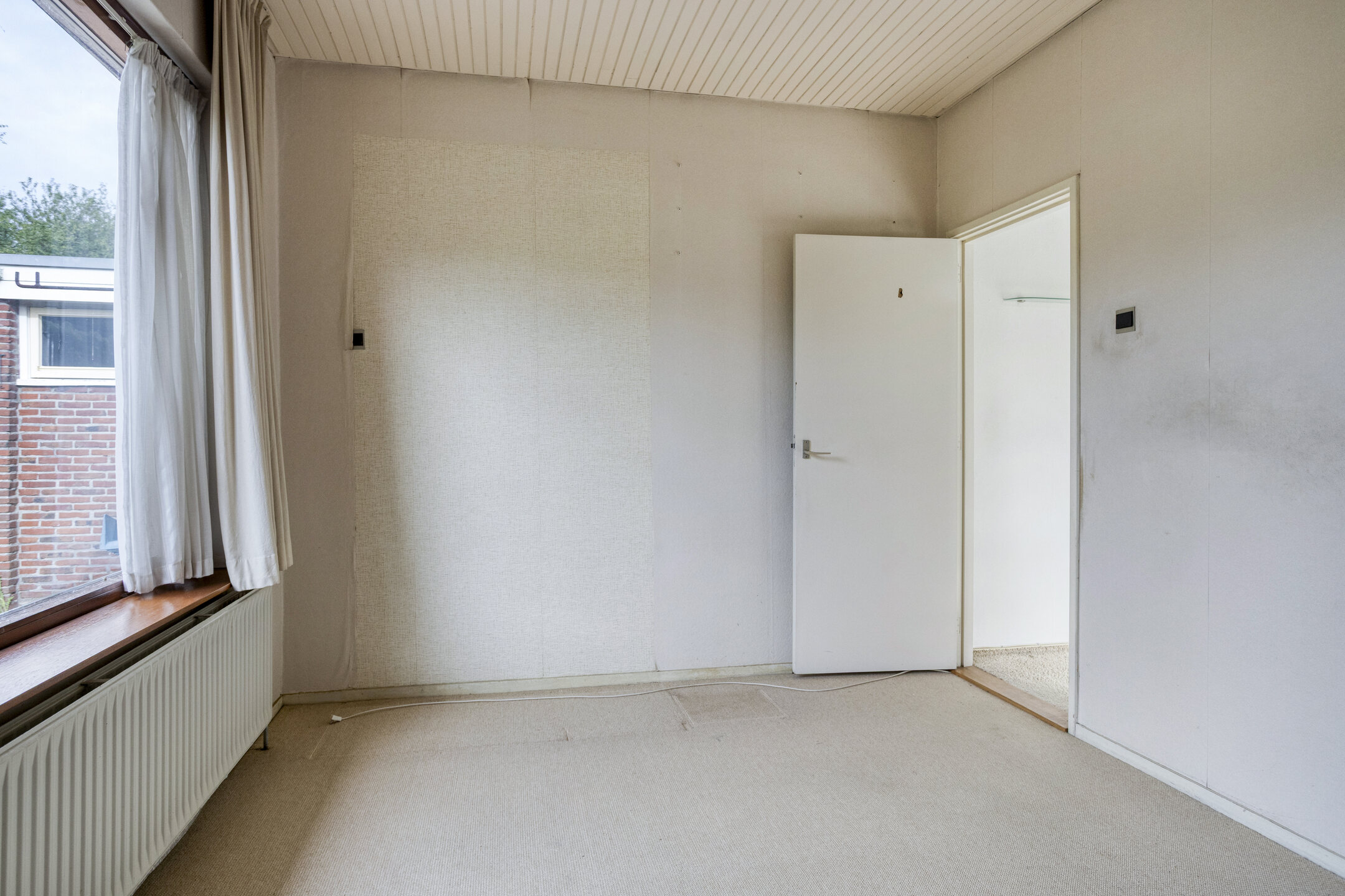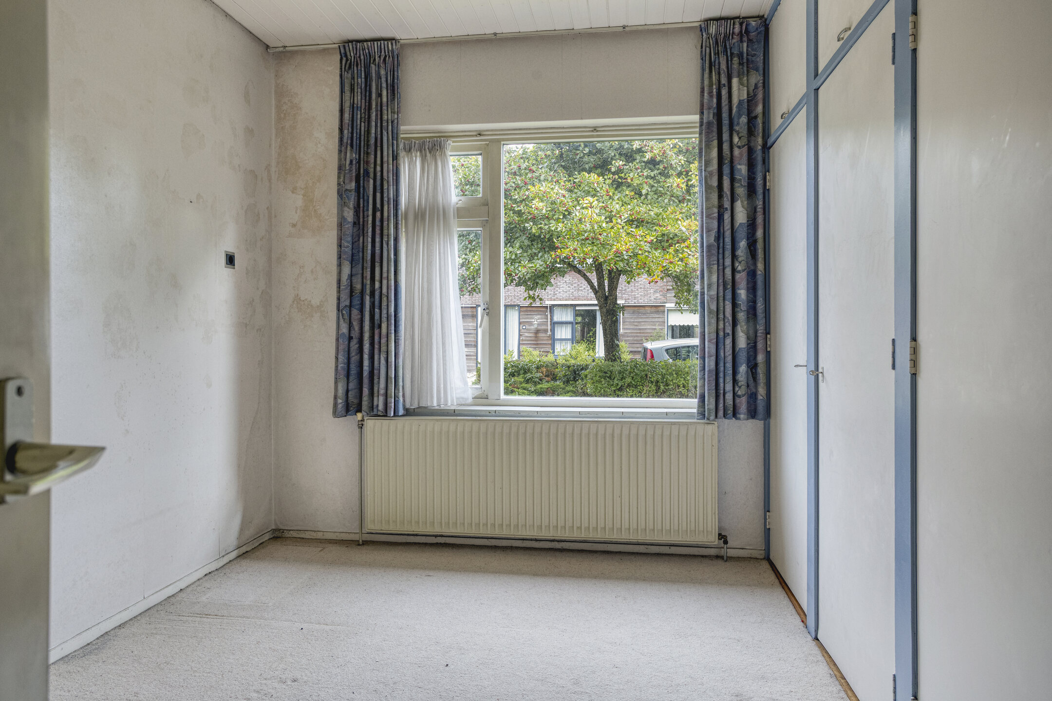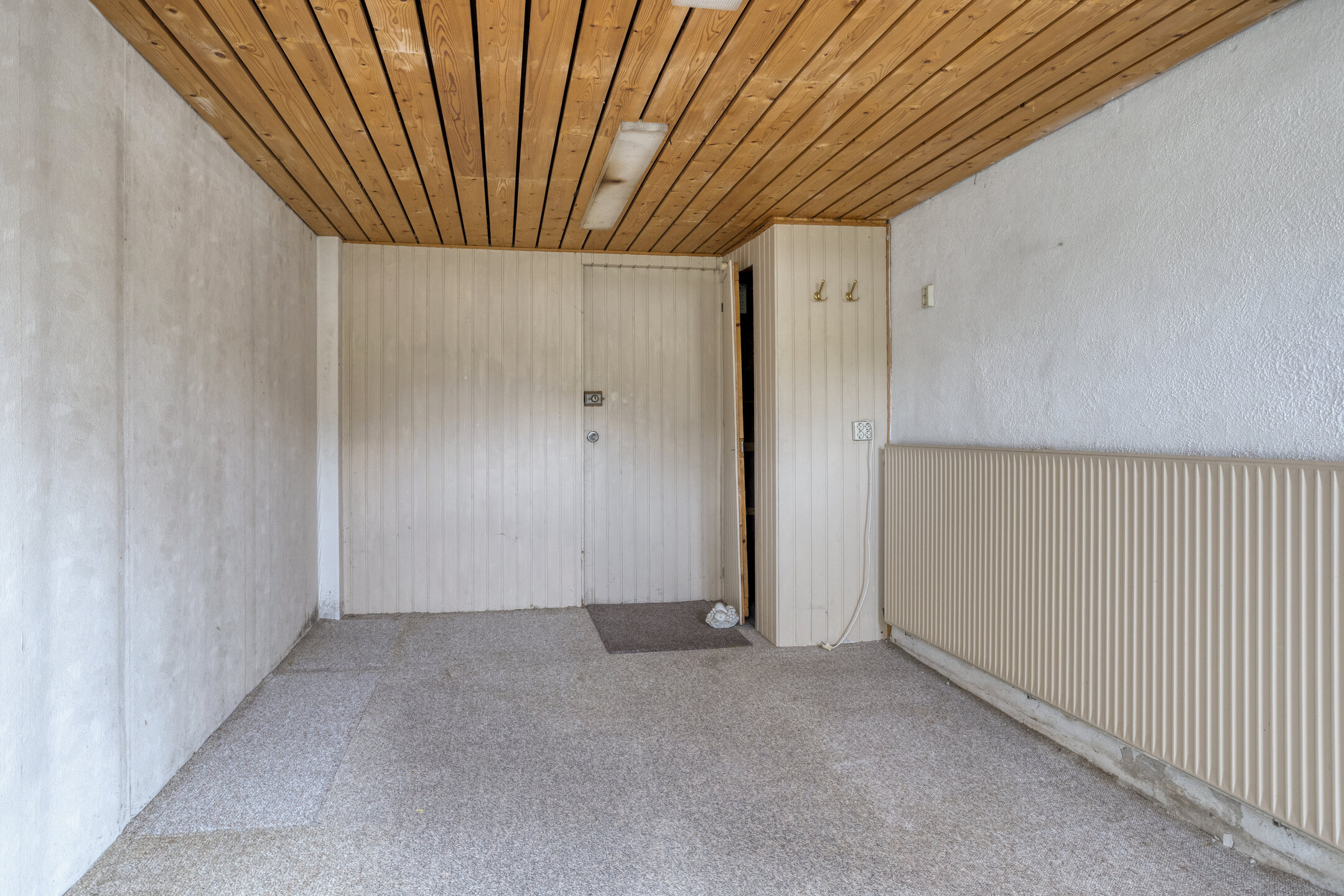 De tweede slaapkamer is eveneens vanuit de hal bereikbaar en heeft een vaste kastenwand. Deze kamer is circa 14 m² groot en herbergt tevens de CV-ketel. Aan deze slaapkamer grenst de garage, die beschikt over een separaat toilet.