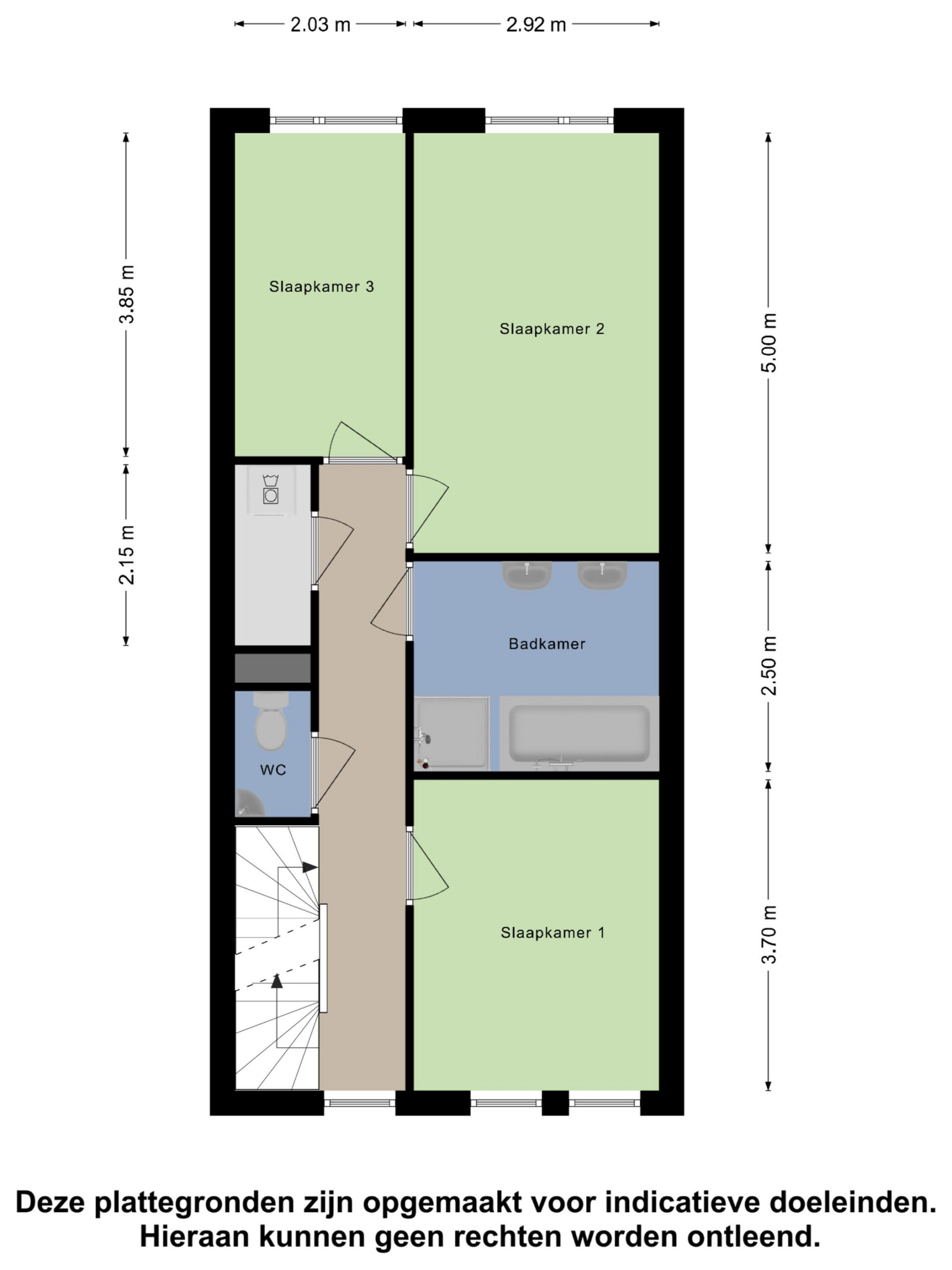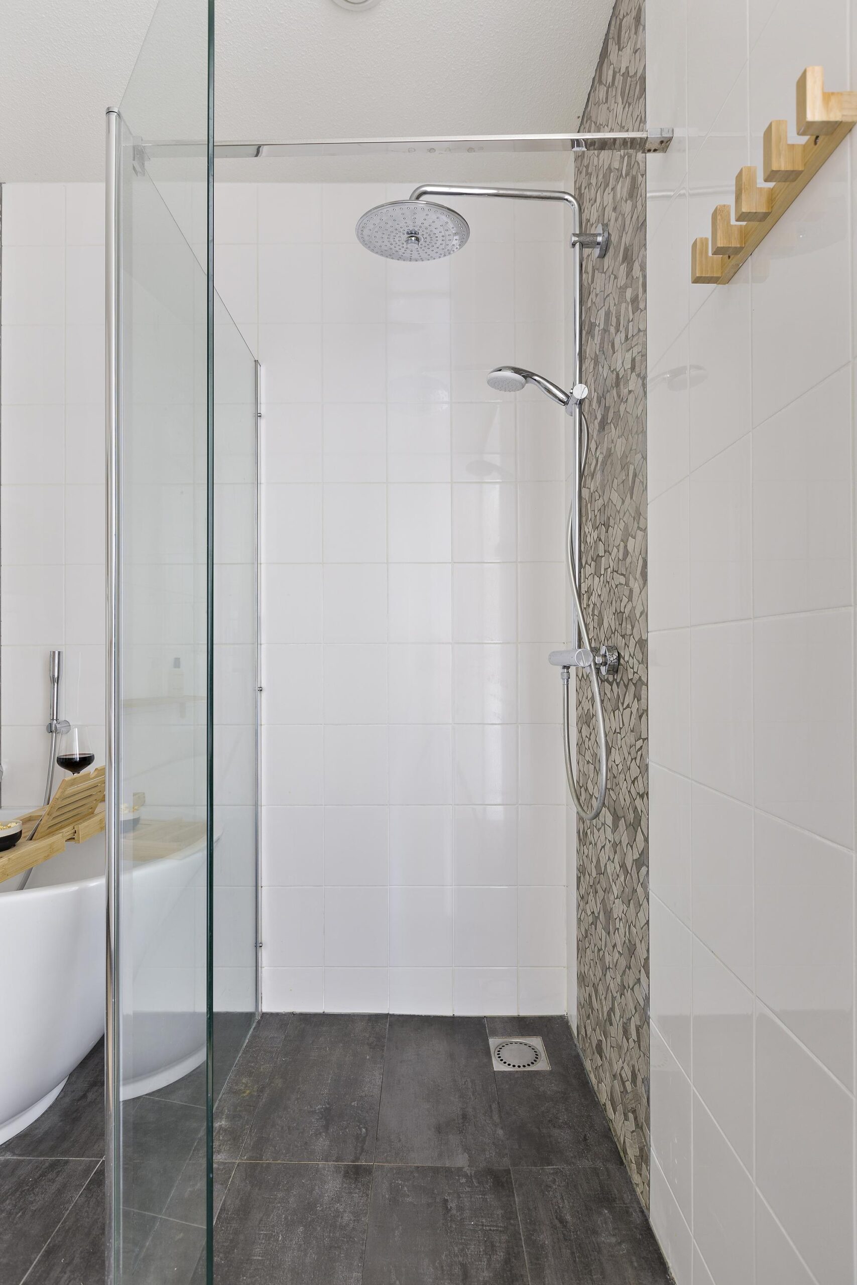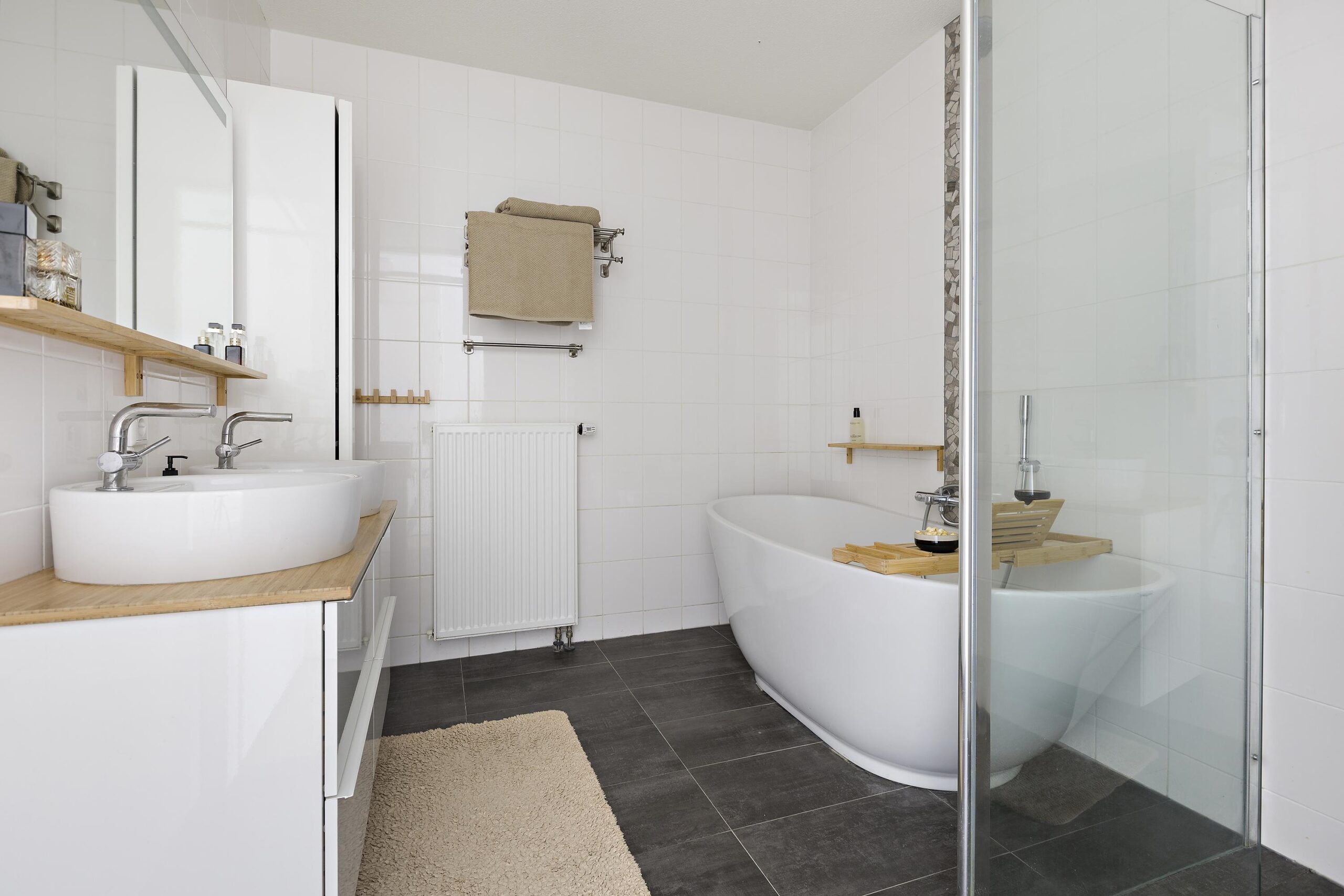 Op de eerste verdieping bevinden zich drie slaapkamers van goed formaat (circa: 8 m², 11 m² en 15 m²). Daarnaast is er een aparte toiletruimte en een praktische wasruimte met aansluitingen voor de wasmachine en droger. De badkamer is ruim en voorzien van een inloopdouche, ligbad en dubbele wastafel.