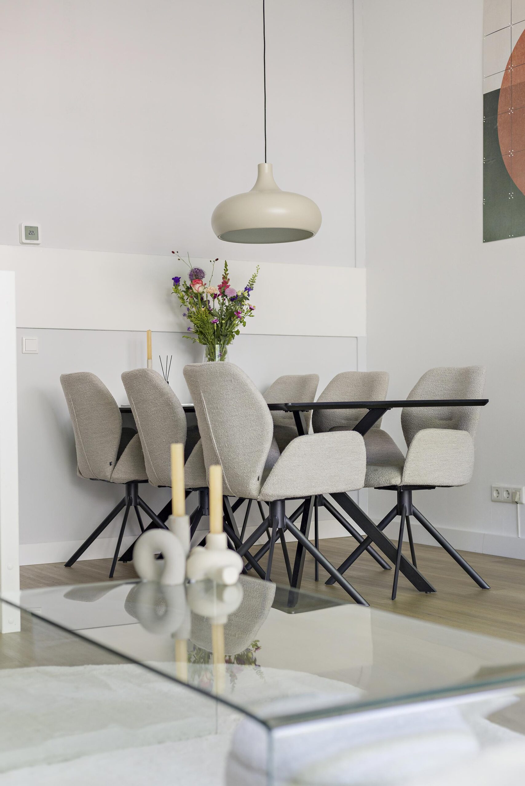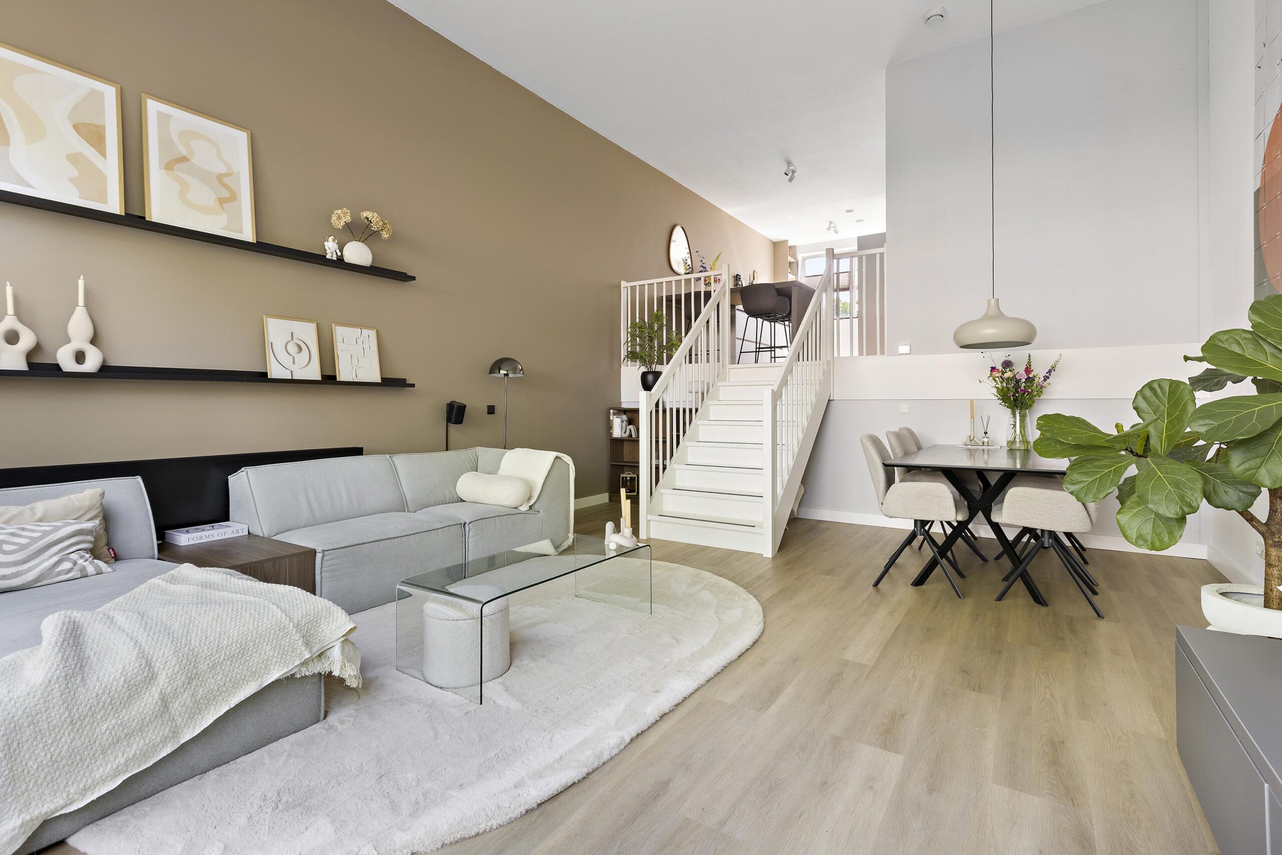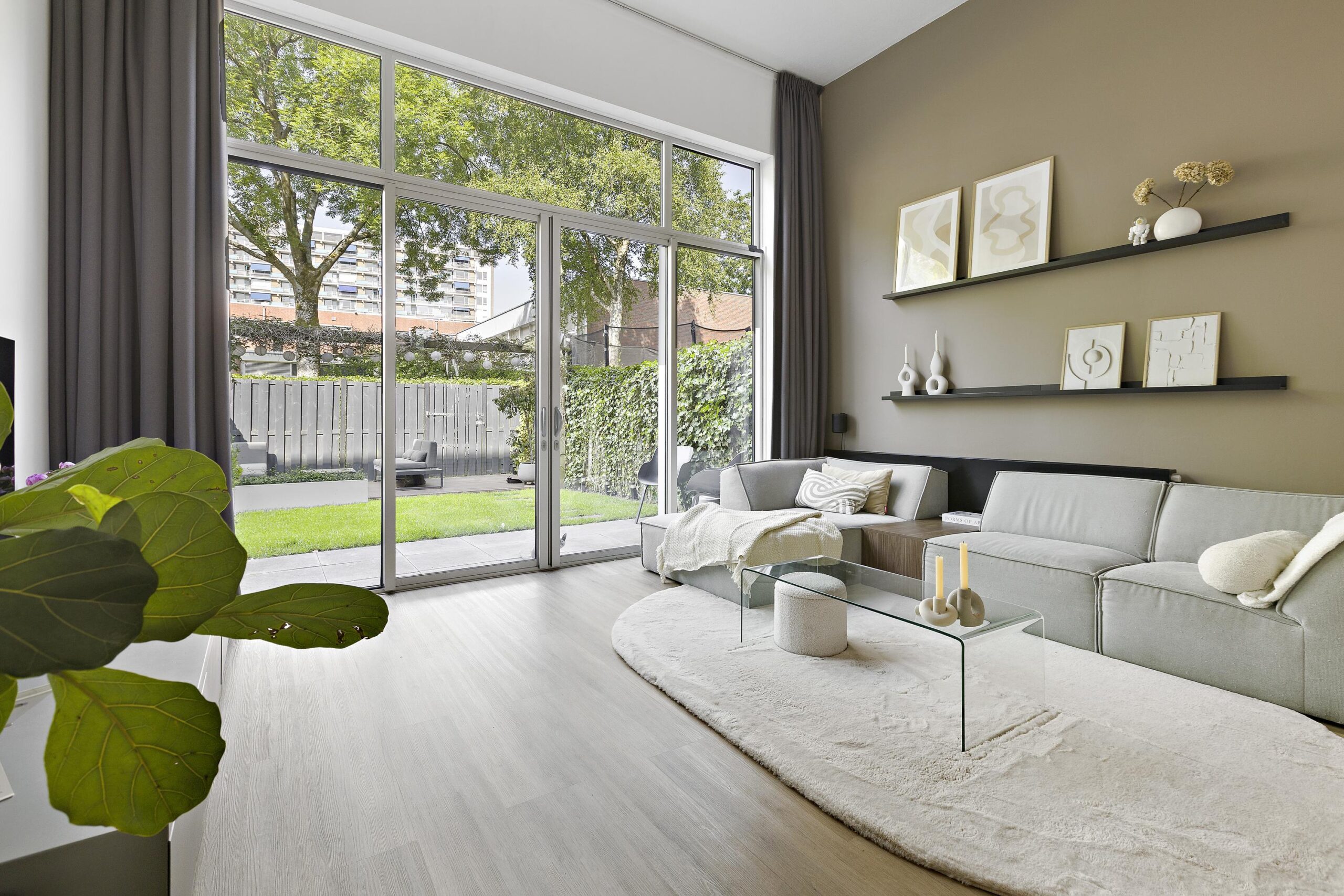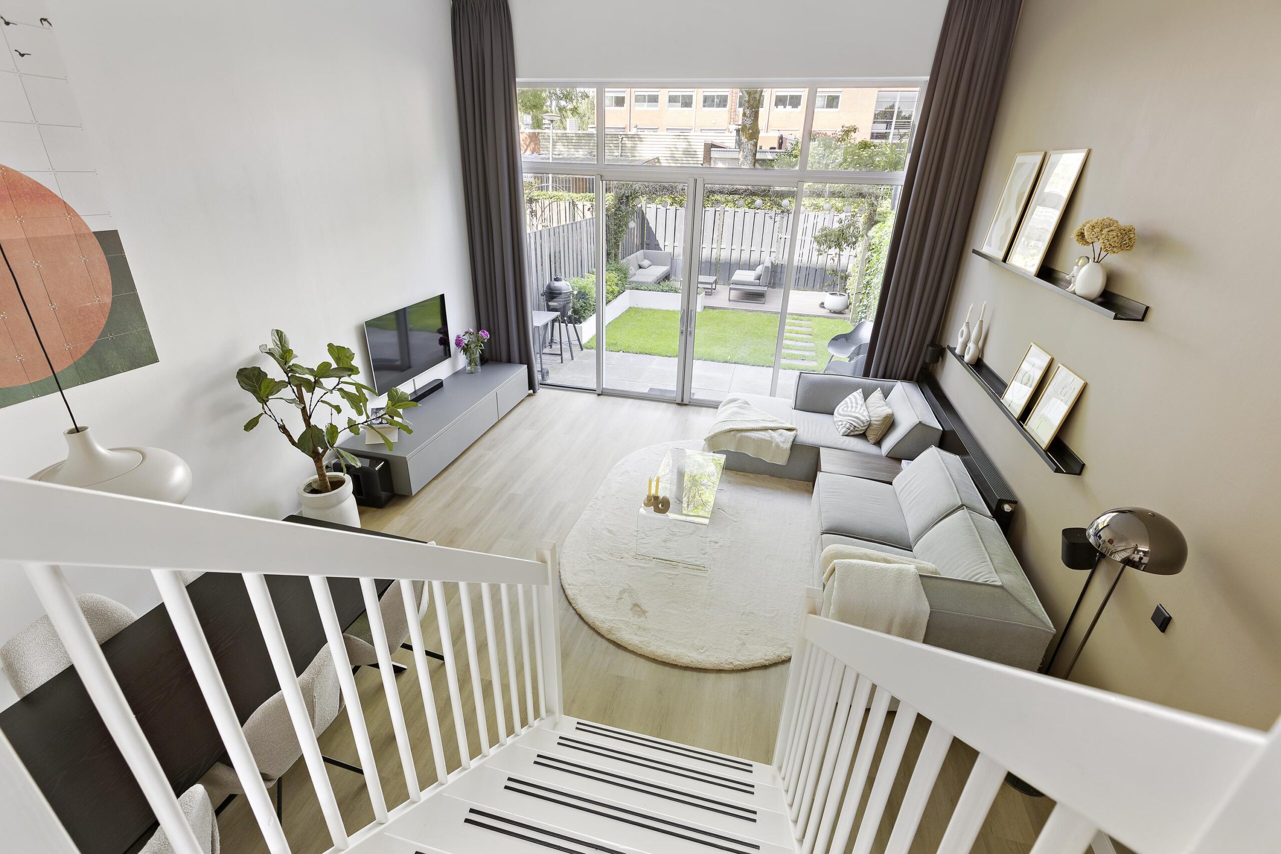 De speelse split-level indeling geeft de woning een uniek karakter: de living bevindt zich op een verlaagd niveau, met hoge plafonds en een overvloed aan natuurlijk licht dankzij de grotendeels glazen achterpui. De gestucte wanden zorgen daarbij voor een strakke en tijdloze afwerking. Via de openslaande deuren stap je rechtstreeks de zonnige tuin in, waardoor binnen en buiten op een prachtige manier samenkomen.