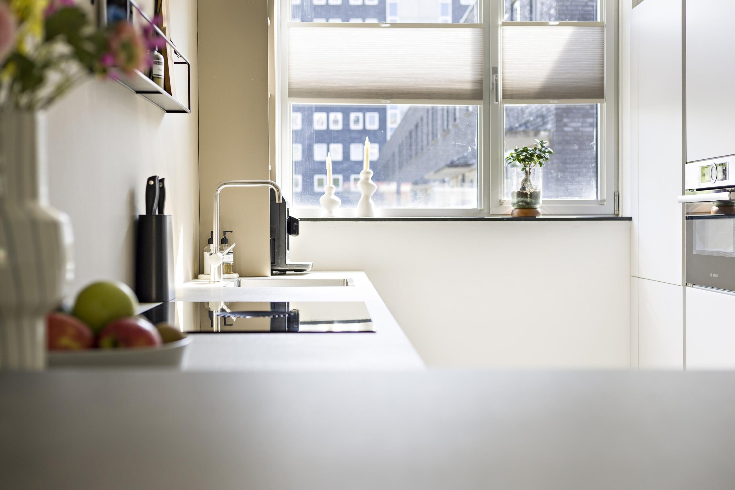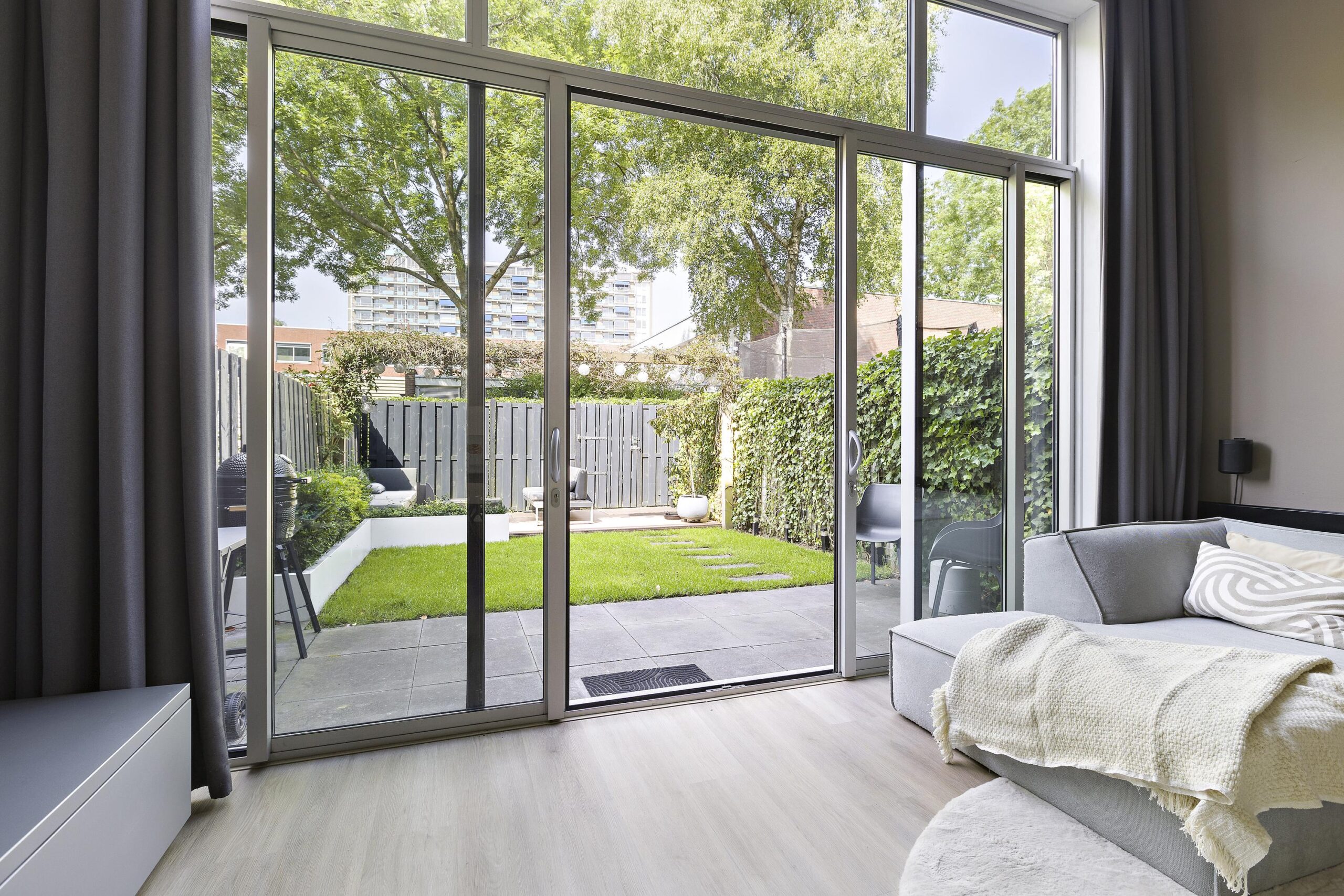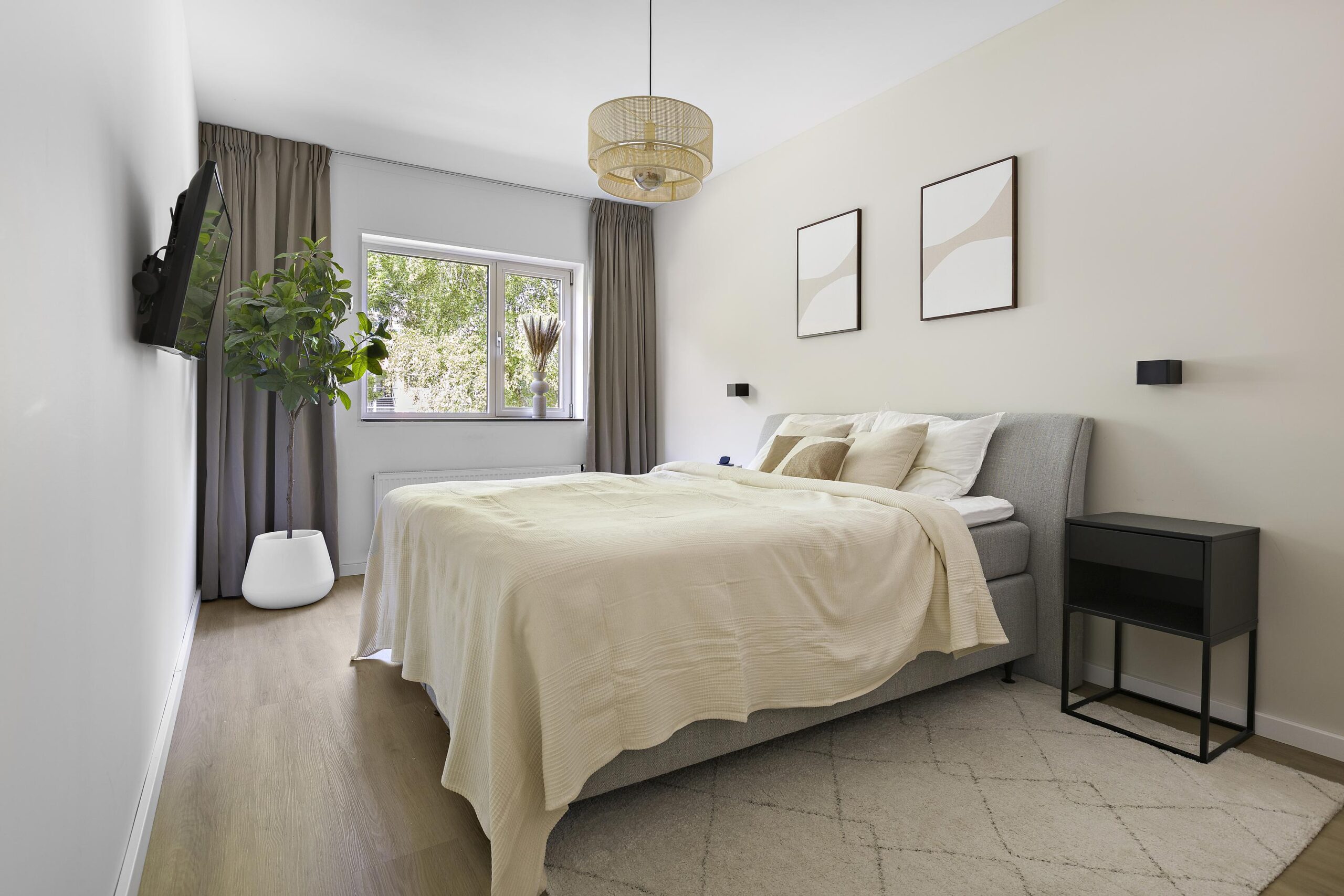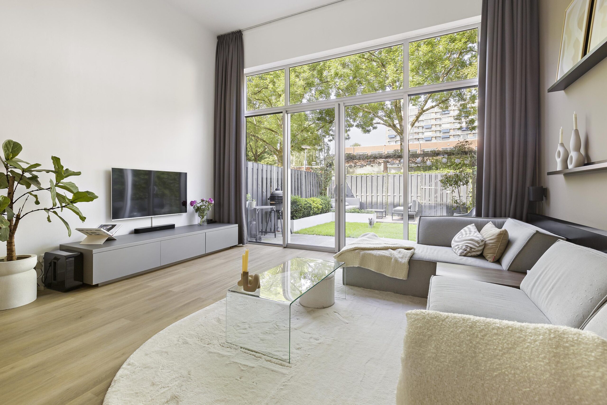 De speelse split-level indeling geeft de woning een uniek karakter: de living bevindt zich op een verlaagd niveau, met hoge plafonds en een overvloed aan natuurlijk licht dankzij de grotendeels glazen achterpui. De gestucte wanden zorgen daarbij voor een strakke en tijdloze afwerking. Via de openslaande deuren stap je rechtstreeks de zonnige tuin in, waardoor binnen en buiten op een prachtige manier samenkomen.