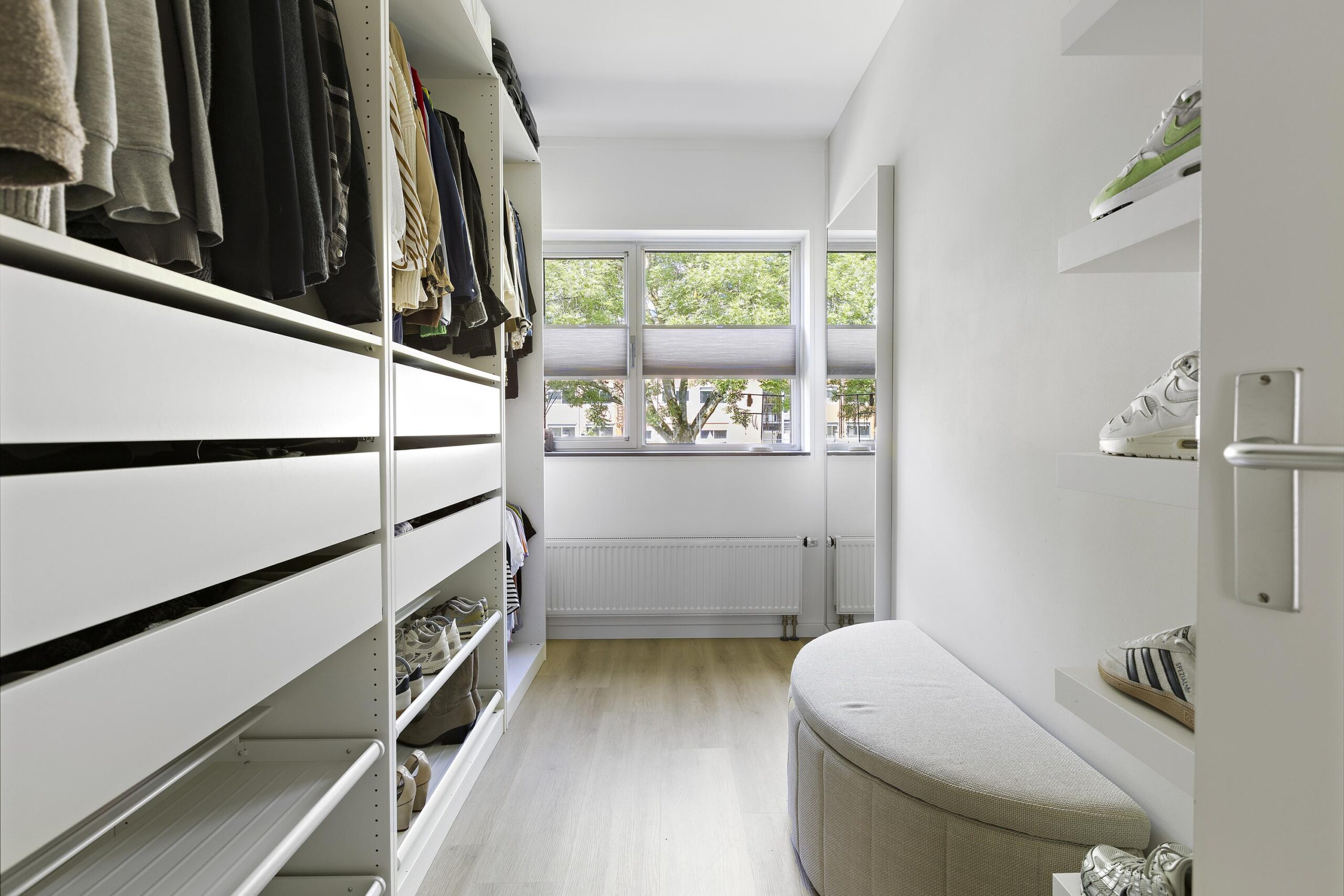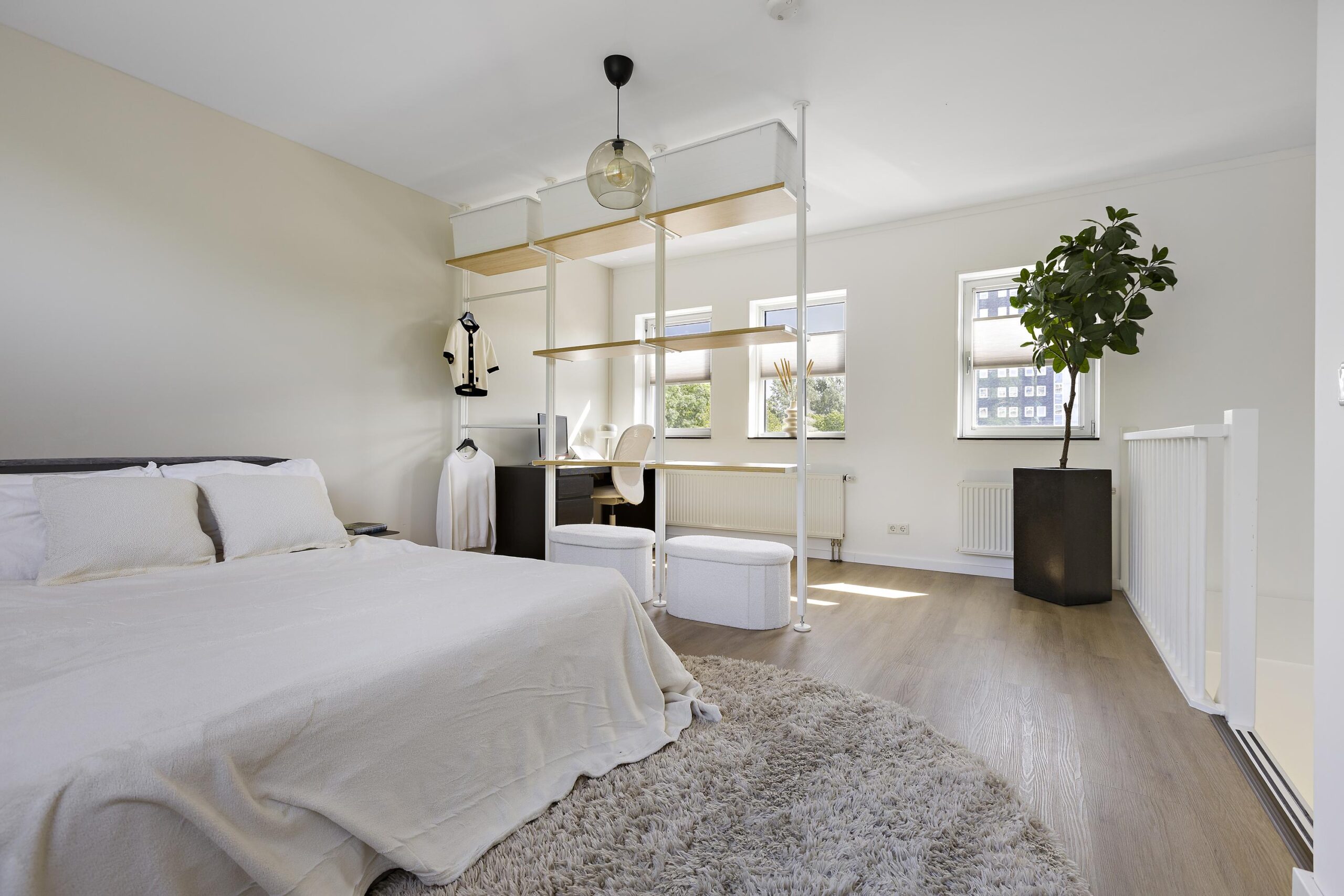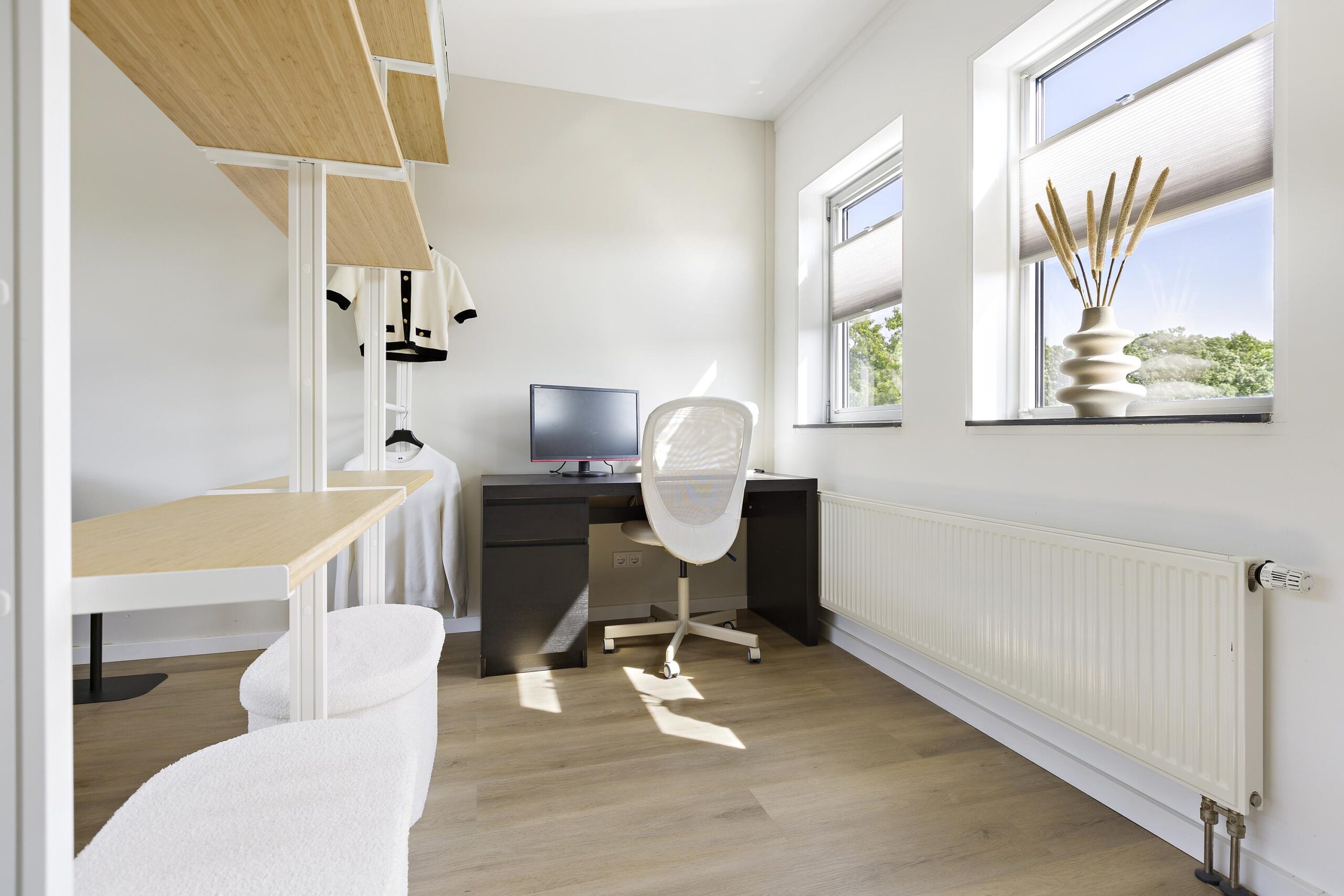 Op de tweede verdieping bevindt zich de ruime vierde slaapkamer. Deze kamer is voorzien van een modern modulair open kastsysteem, dat flexibiliteit biedt voor het opbergen van kleding en spullen, maar ook gemakkelijk kan worden ingericht als werkplek of hobbyruimte. Dankzij het formaat en de indeling is deze kamer veelzijdig te gebruiken en biedt het volop mogelijkheden om aan te passen aan je eigen wensen. Bovendien bestaat er de mogelijkheid om een royaal dakterras van circa 24 m² te creëren.